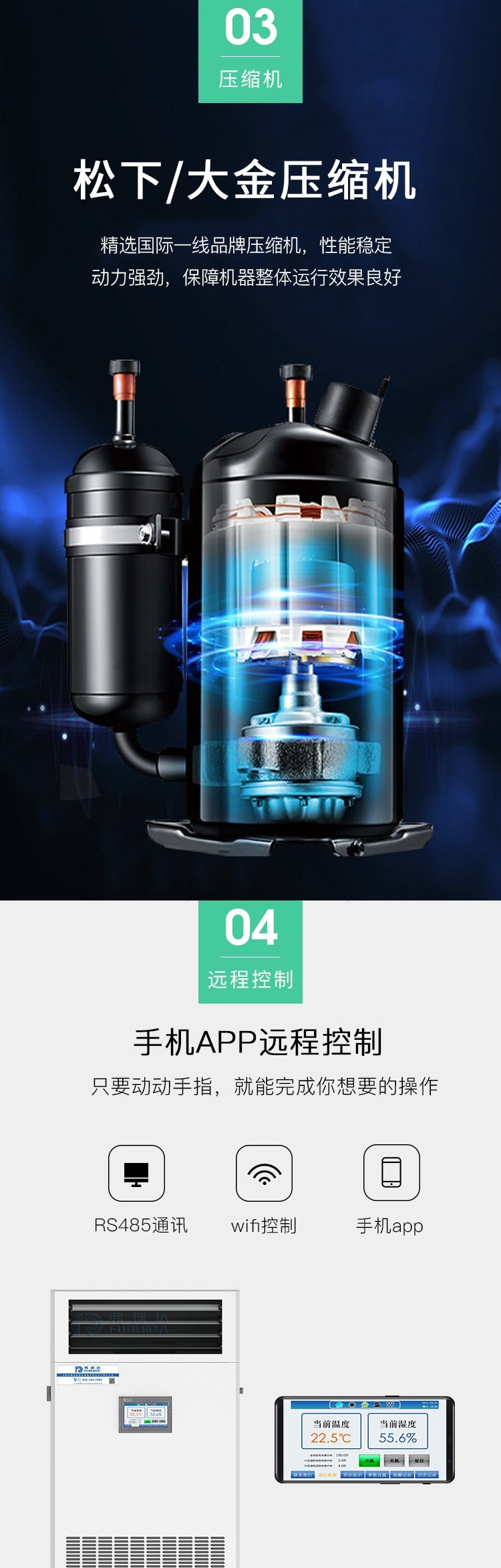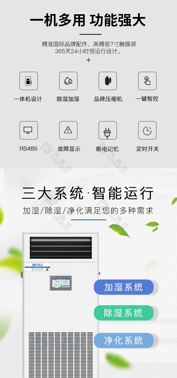 v 控制系統(tǒng):機(jī)組采用PLC控制系統(tǒng),7寸彩色觸摸屏,人機(jī)交互界面,中文顯示、操作簡單。也可采用微電腦控制系統(tǒng),更節(jié)省成本。可根據(jù)用戶設(shè)定的相對濕度自動啟停、精度高、可靠性好、外形美觀。