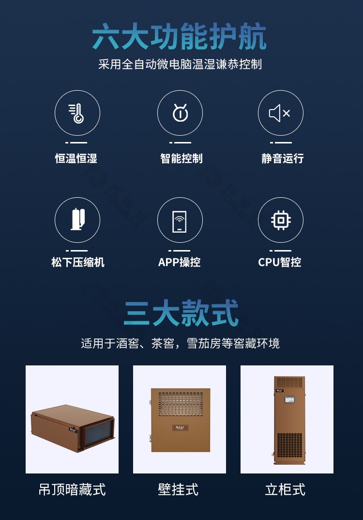 酒窖空調(diào)又稱酒窖恒溫恒濕機,是一款低溫窖藏精密空調(diào)設(shè)備,常用于酒窖、雪茄房、古玩室、茶葉窖等窖藏環(huán)境,溫度控制10-26℃±2℃,濕度控制RH40-75%±5%。