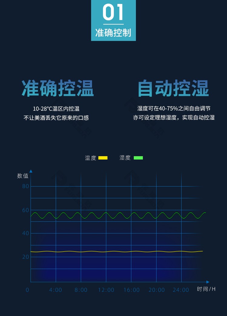 v  充分滿足美酒儲藏時對于環(huán)境溫濕度的苛刻要求,可實現(xiàn)溫度控制精度±1℃,濕度控制精度±5%RH。